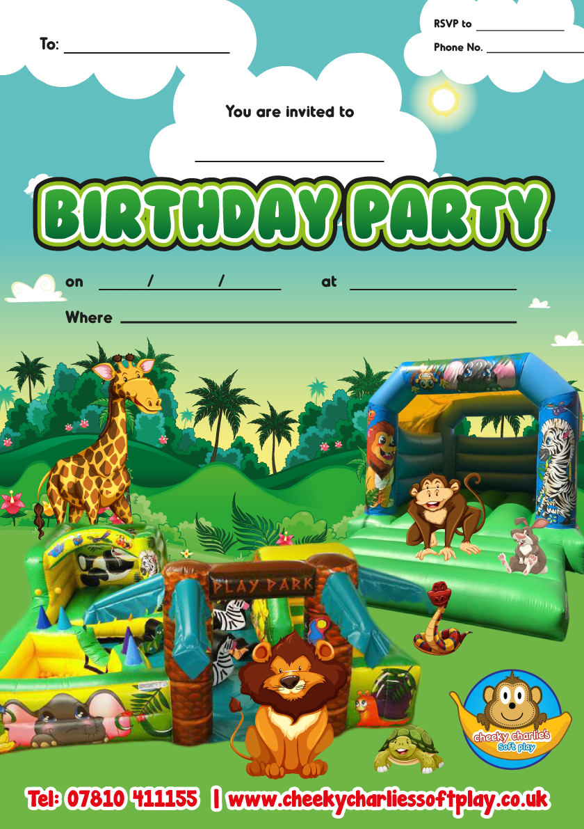 We have designed a few different party invites, this one in particular is aimed at all of our young customers who love the Safari Animals. If you are hiring our Jungle Bouncy Castle or Jungle Front Slide Bouncy Castle, then this invite would be perfect. We now have our Jungle Play Park as shown in the party invite.