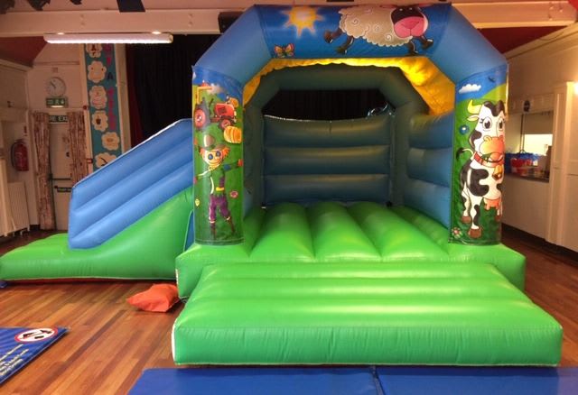 This is our new Farmyard Blue and Green Side Slide Bouncy Castle now available to hire in Istead Rise, Orpington, New Ash Green and surrounding areas.