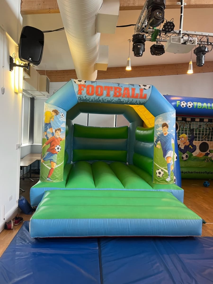 Our Football Blue and Green Fun Bouncy Castle is a perfect choice of inflatable to hire as the theme suits all Birthday Parties for both boys and girls. It available to hire both side and outside.